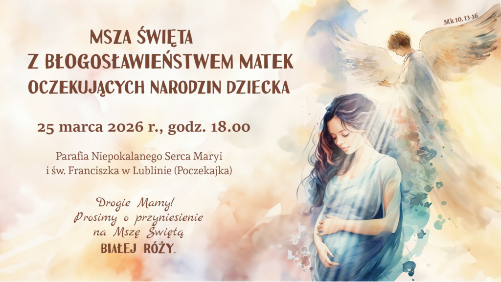 W środę 25 marca br. przypada uroczystość Zwiastowania Najświętszej Maryi Pannie. Tego dnia parafia Niepokalanego Serca Maryi i św. Franciszka w Lublinie (Poczekajka) zaprasza na Mszę Świętą o godzinie 18.00 z indywidualnym błogosławieństwem matek oczekujących narodzin dziecka (szczegóły na plakacie ).
